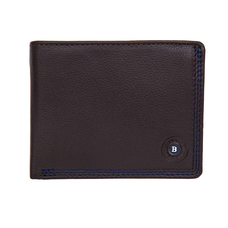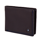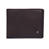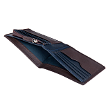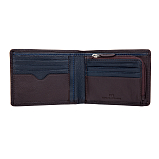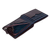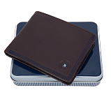 Мужское портмоне из натуральной кожи, раскладывается пополам, внутри отделение для купюр, три потайных кармана, восемь кармашков для пластиковых карт. Карман для мелочи на молнии. Оснащено RFID-защитой, что позволяет защитить банковские карты от считывания. Упаковано в подарочную жестяную коробку.