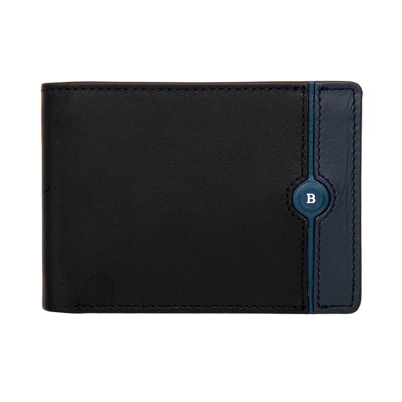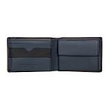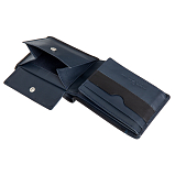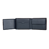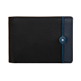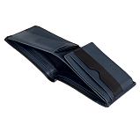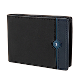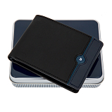 Мужское портмоне из натуральной кожи, раскладывается пополам, внутри два отделения для купюр, три потайных кармана, пять кармашков для пластиковых карт, сетчатое отделение для пропуска, карман для мелочи на кнопке. Оснащено RFID-защитой, что позволяет защитить банковские карты от считывания. Упаковано в подарочную жестяную коробку.