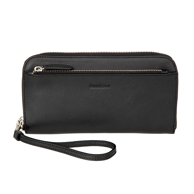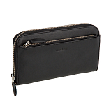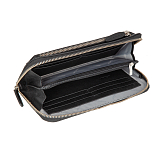 Мужской чёрный клатч из мягкой натуральной кожи. Закрывается на молнию. Внутри два отделения для купюр, продольный карман на молнии и двенадцать кармашков для пластиковых карт. Снаружи на лицевой стороне карман на молнии. Имеет защитный слой от считывания карт RFID-Protection. Оснащён съёмным ремешком на запястье. Размеры: 13 х 23 х 2,5 см. Поставляется в фирменной коробке.