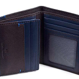 Портмоне раскладывается пополам, внутри одно отделение для купюр, два потайных кармана, девять кармашков для пластиковых карт, два сетчатых кармана для пропуска. Оснащено RFID-защитой, что позволяет защитить банковские карты от считывания. Упаковано в подарочную жестяную коробку.