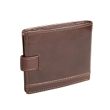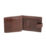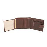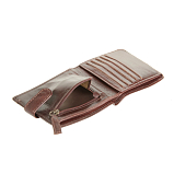 Внутри два отделения для купюр, карман для монет на молнии, сетчатый карман и одиннадцать кармашков для пластиковых карт. Закрывается клапаном на кнопке.