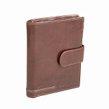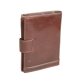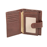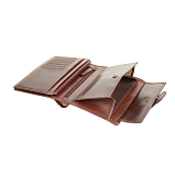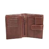 Внутри два отделения для купюр, карман для монет на кнопке, два кармана для документов, карман на молнии и пять кармашков для пластиковых карт. Имеется дополнительный вкладыш, на котором расположены три кармана для документов, сетчатый карман и семь кармашков для пластиковых карт. Портмоне закрывается клапаном на кнопке.