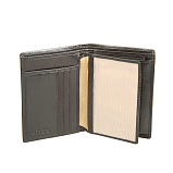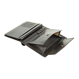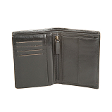 Внутри два отделения для купюр, карман для монет на кнопке, карман для документов, карман на молнии и четыре кармашка для пластиковых карт. Имеется дополнительный вкладыш, на котором расположены карман для документов, сетчатый карман и четыре кармашка для пластиковых карт.