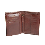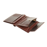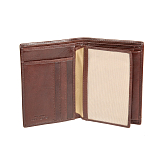 Внутри два отделения для купюр, карман для монет на кнопке, карман для документов, карман на молнии и четыре кармашка для пластиковых карт. Имеется дополнительный вкладыш, на котором расположены карман для документов, сетчатый карман и четыре кармашка для пластиковых карт.