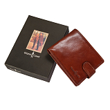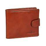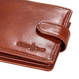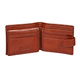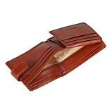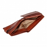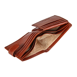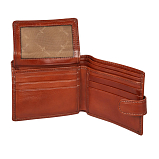 Внутри три отделения для купюр, два потайных кармана, сетчатый карман и девять кармашков для пластиковых карт. Имеет защитный слой от считывания карт PFID-Protection. Закрывается клапаном на кнопке.