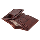 Портмоне раскладывается пополам. Внутри два отделения для купюр, два потайных кармана, два сетчатых кармана и десять кармашков для пластиковых карт.
