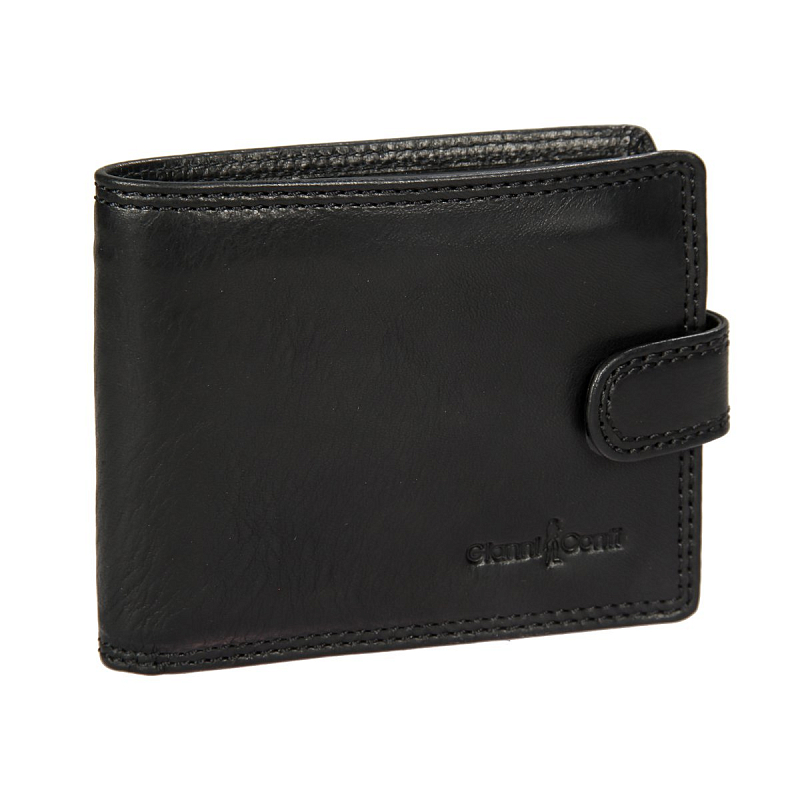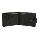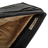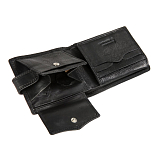 Портмоне закрывается клапаном на кнопке. Внутри два отдела для купюр, один из них на молнии, отдел для монет на кнопке, два кармана для документов, сетчатый карман, шесть кармашков для пластиковых карт. Имеет RFID Protection (защитный слой от считывания карт).