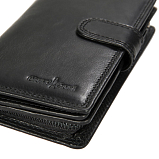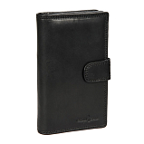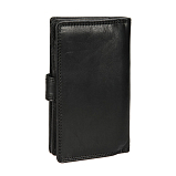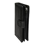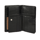 Закрывается клапаном на кнопке. Внутри восемь карманов для документов, тринадцать кармашков для пластиковых карт, сетчатый карман, потайной карман, два отдела для купюр. Снаружи на задней стенке двойное отделение для монет на молнии.