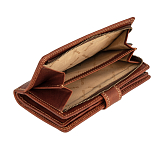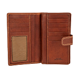 Закрывается клапаном на кнопке. Внутри восемь карманов для документов, тринадцать кармашков для пластиковых карт, сетчатый карман, потайной карман, два отдела для купюр. Снаружи на задней стенке двойное отделение для монет на молнии.