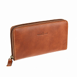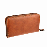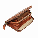 Портмоне закрывается по периметру на молнию. Внутри четыре отдела для купюр и документов, два потайных кармашка, восемь кармашков для пластиковых карт, отделение для монет на молнии.