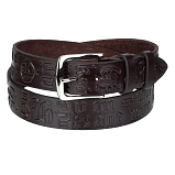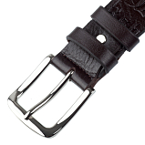 Джинсовый ремень из натуральной цельной кожи с тиснением шириной 4 см. Пряжка стального цвета. Ремень имеет 5 отверстий для регулировки и винтовое крепление для укорачивания. Размер пряжки: 5,5 х 5,5 см.