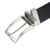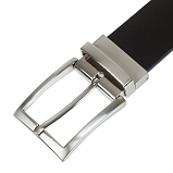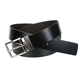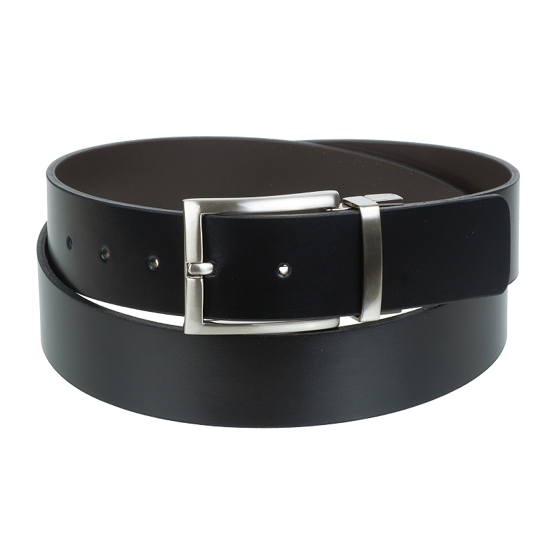 Мужской ремень из натуральной кожи. Универсальная двусторонняя модель - простым поворотом пряжки меняет цвет полотна. Пряжка симметричная белая, сатинированная, с поворотным механизмом. Размер: 4,8 х 6,2 см.