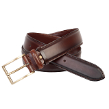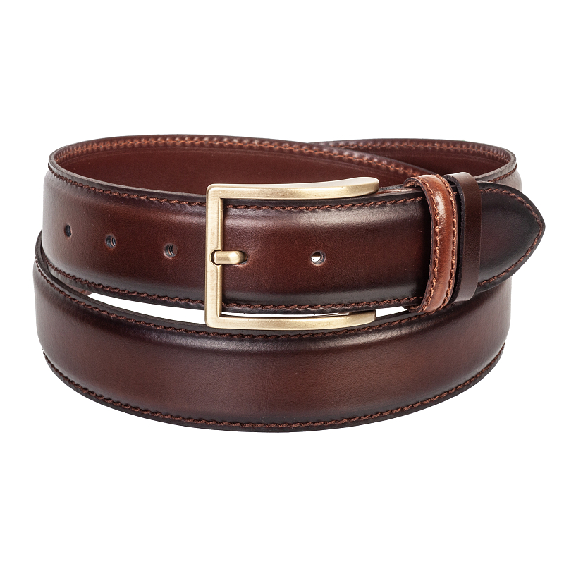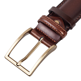 Кожаный ремень шириной 40 мм. Модель имеет декоративную строчку в тон ремня, 2 шлевки разного цвета со строчкой и без. Пряжка с винтовым креплением для укорачивания - цвета светлой бронзы. Размер пряжки: 5 х 5.5 см.