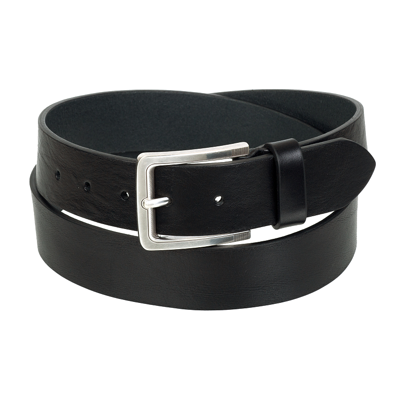 Кожаный ремень шириной 40 мм. Пряжка стального цвета - размер пряжки: 6 х 5,2 см. Модель имеет 5 отверстий для регулировки и винтовое крепление для укорачивания.