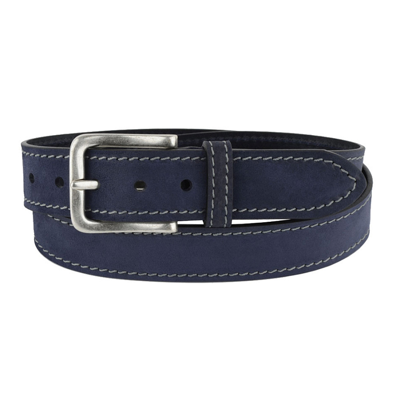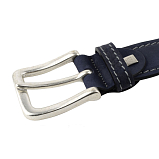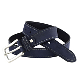 Синий джинсовый ремень Sergio Belotti изготовлен из натуральной воловьей кожи с отделкой пряжки под серебро 5,5 х 6 см, модель с режущей системой уменьшения длины полотна до надлежащего размера