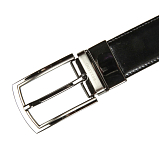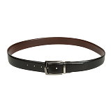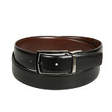 Мужской брючный ремень. Изготовлен из высококачественной кожи. Универсальная классическая двусторонняя модель - простым поворотом пряжки меняет цвет полотна (чёрный/коричневый). Размер пряжки: 5,5 см х 4 см. Поставляется в фирменной коробке.