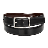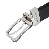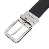 Мужской брючный ремень. Изготовлен из высококачественной кожи. Универсальная классическая двусторонняя модель - простым поворотом пряжки меняет цвет полотна (чёрный/коричневый). Размер пряжки: 5 см х 4,3 см. Ремень укорачивается по длине. Поставляется в фирменном мешочке.