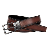 Мужской брючный ремень. Изготовлен из высококачественной кожи. Универсальная классическая двусторонняя модель - простым поворотом пряжки меняет цвет полотна (чёрный/светло - коричневый). Размер пряжки: 5 х 4 см. Поставляется в фирменном мещочке.