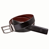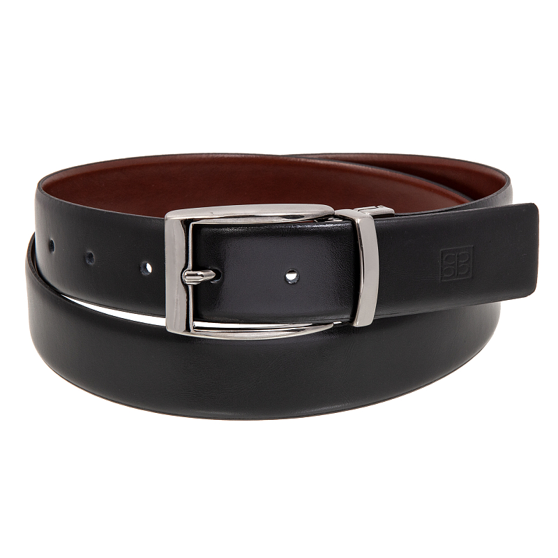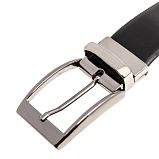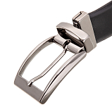 Мужской брючный ремень из натуральной кожи. Универсальная классическая двусторонняя модель - простым поворотом пряжки меняет цвет полотна. Идеальное решение для использования в брюках разного цвета. Пряжка с покрытием чёрного цвета, размер: 5,5 х 4,5 см.