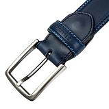 Брючный ремень из натуральной кожи высочайшего качества с перфорированной синей строчкой. Пряжка размерами 5 х 4,3 см с отделкой под серебро. Регулируется по длине.