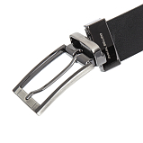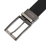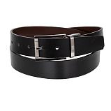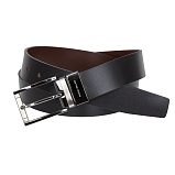 Мужской брючный ремень. Изготовлен из высококачественной кожи. Универсальная классическая двусторонняя модель - простым поворотом пряжки меняет цвет полотна (чёрный/коричневый). Размер пряжки: 5 х 4.5 см. Поставляется в фирменном мещочке.