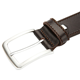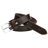 Ремень для джинсов тёмно-коричневого цвета из цельной натуральной кожи шириной 40 мм. Крупная строчка совпадающая по цвету с цветом ремня. Пряжка 5 * 5,5 см., матовая серого цвета. Подарочная коробка.