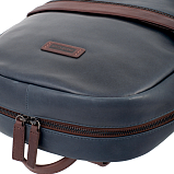Рюкзак Gianni Conti из натуральной кожи, синего цвета, с одним отделом на двойной молнии. В основном отделении имеется отделение для планшета или ноутбука на липучке, карман на молнии, три кармашка для мелких предметов. С внешней стороны на лицевой стенке два кармана на молнии. Имеется ручка и регулируемые плечевые лямки. Сзади имеется приспособление для крепления на ручку чемодана.