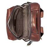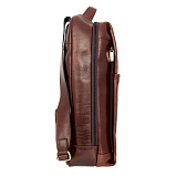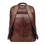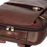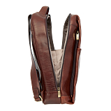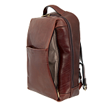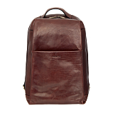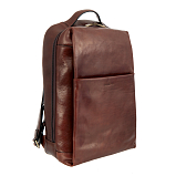 Кожаный рюкзак с одним отделом на двойной молнии. Основное отделение рюкзака имеет вертикальную загрузку, в нём есть внутреннее отделение для планшета или ноутбука на липучке, карман для документов на молнии, два кармашка для мелких предметов и один кармашек для ручки. С внешней стороны на лицевой стенке карман быстрого доступа на молнии и по бокам два отделения, вертикальные, на молнии. На задней стенке один карман на молнии. Оснащён регулируемыми лямками.