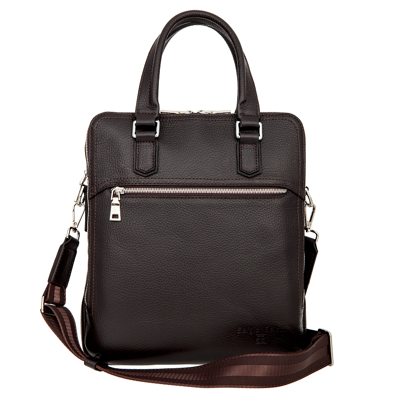 Мужская сумка коричневого цвета из мягкой натуральной кожи зернистой фактуры. Состоит из двух независимых отделений на молниях. Внутри карман на молнии, два кармашка для мелких предметов и отделение для планшета. Снаружи на лицевой и задней стенках карман на молнии. Планшет оснащён удобной верхней ручкой и съёмным регулируемым плечевым ремнём на карабинах. Цвет фурнитуры - серебро.
