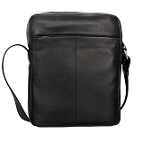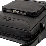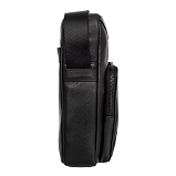 Сумка через плечо черного цвета из натуральной кожи. Сумка закрывается на молнию, внутри одно главное отделение, в котором расположены: карман на молнии и карман для мобильного телефона, два держателя для авторучки. С внешней стороны на лицевой и задней стенках расположены два отдела на молнии. Сумка оснащена съёмным регулируемым плечевым ремнём на карабинах.