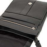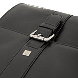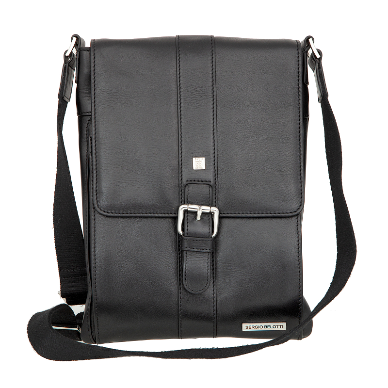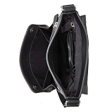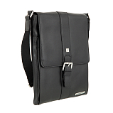 Мужская сумка-планшет чёрного цвета из мягкой натуральной кожи гладкой фактуры. Закрывается клапаном на магнитной кнопке. Внутри одно основное отделение, пять кармашков для пластиковых карт, карман для документов на молнии, кармашек для мобильного телефона и два держателя для авторучек. На лицевой стороне под клапаном карман на молнии и двойной кармашек на магнитных кнопках. На внутренней стороне расположен карман на молнии. Планшет оснащён регулируемым плечевым ремнём. Цвет фурнитуры - серебро. Размеры: 28 x 21,5 x 5 см.