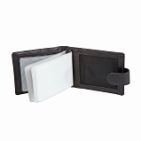 Внутри блок, состоящий из шестнадцати прозрачных файлов для визитных карт. Внутренние стороны идентичны и имеют по одному сетчатому карману для пластиковых карт. Закрывается клапаном на кнопке.
