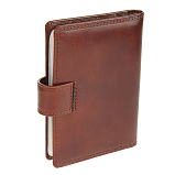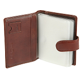 Внутри блок, состоящий из шестнадцати прозрачных файлов для пластиковых карт. На правой внутренней стороне располагается сетчатое отделение. На левой — кожаное отделение с кармашком для пластиковых карт и кармашек для SIM-карты. Закрывается клапаном на кнопке.