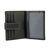 Картхолдер из натуральной кожи. Раскладывается пополам, закрывается на хлястик с кнопкой. Внутри сетчатый кармашек, 3 кармашка для пластиковых карт. Снаружи с обеих сторон расположены кармашки для пластиковых карт. Имеет защитный слой от считывания карт RFID Protection. Товар упакован в подарочную коробку от бренда Miguel Bellido. Размеры: 8 х 10,5 х 2 см.