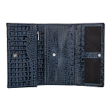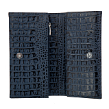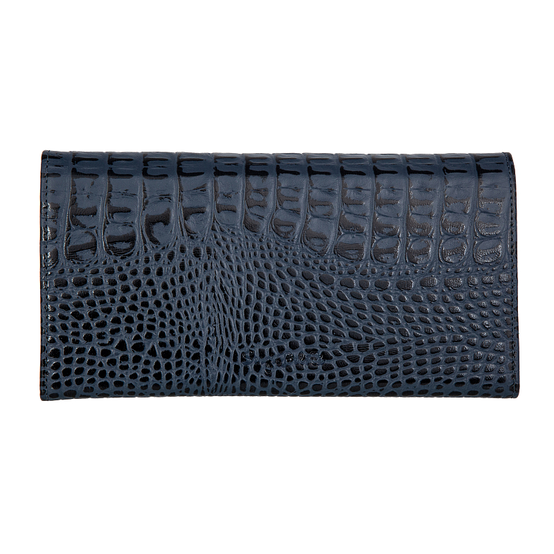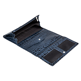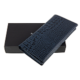 Стильный функциональный синий клатч из натуральной кожи с тиснением под рептилию. Закрывается на кнопку. Внутри два отделения для банкнот, карман для монет на молнии, четыре отдела для документов, два прозрачных кармана для удостоверения или фото, и четырнадцать кармашков для пластиковых карт. Товар упакован в подарочную коробку от бренда Sergio Belotti. Размеры: 11,5 х 21,8 х 4 см.
