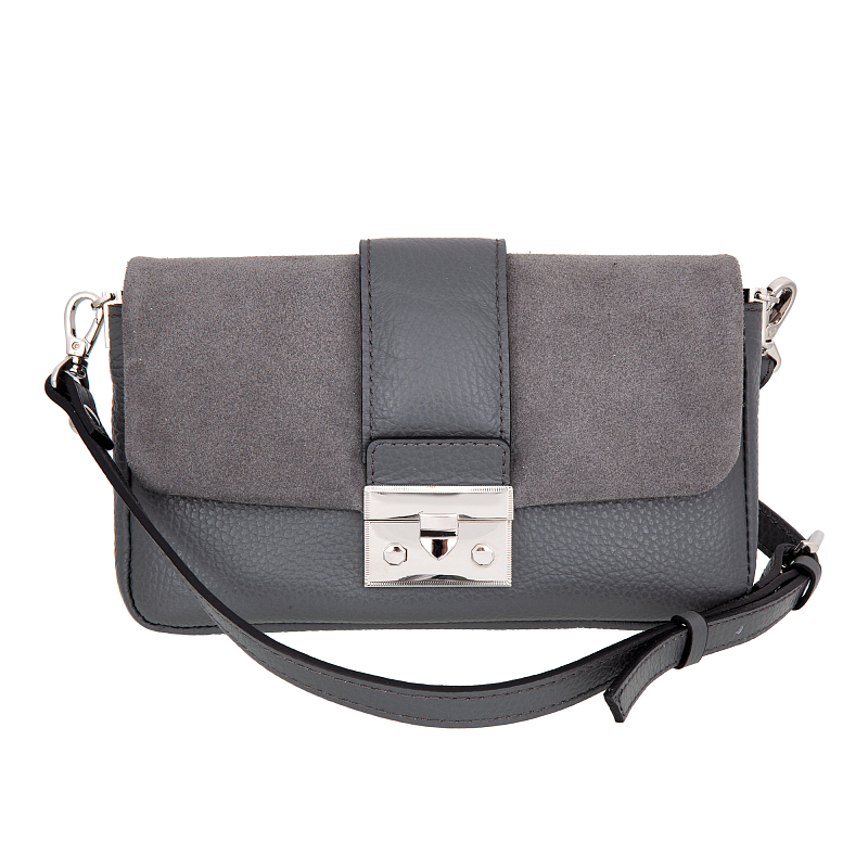 Женская серая сумка-клатч от итальянского бренда Sergio Belotti из натуральной комбинированной кожи. Внутри одно основное отделение и карман для документов на молнии. Закрывается клапаном на оригинальный замок, оснащена съёмным регулируемым плечевым ремешком на карабинах. Цвет фурнитуры - серебро.