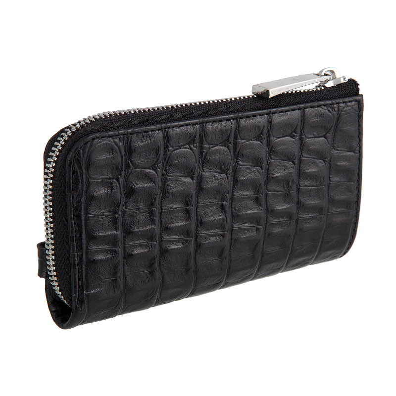 Ключница из натуральной кожи чёрного цвета с выделкой под рептилию. Закрывается на молнию. Внутри отделение с кольцом для ключей, снаружи карабин для фиксации ключницы в сумке или на ремне. Товар упакован в подарочную коробку от бренда Sergio Belotti. Размеры: 14 х 8 х 2 см.