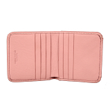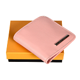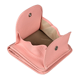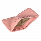 Женское розовое портмоне из мягкой натуральной кожи. Внутри два отделения для купюр и восемь кармашков для пластиковых карт. С внешней стороны на задней стенке монетница на кнопке. Незаменимый аксессуар для маленькой сумочки или клатча.