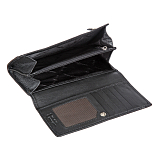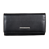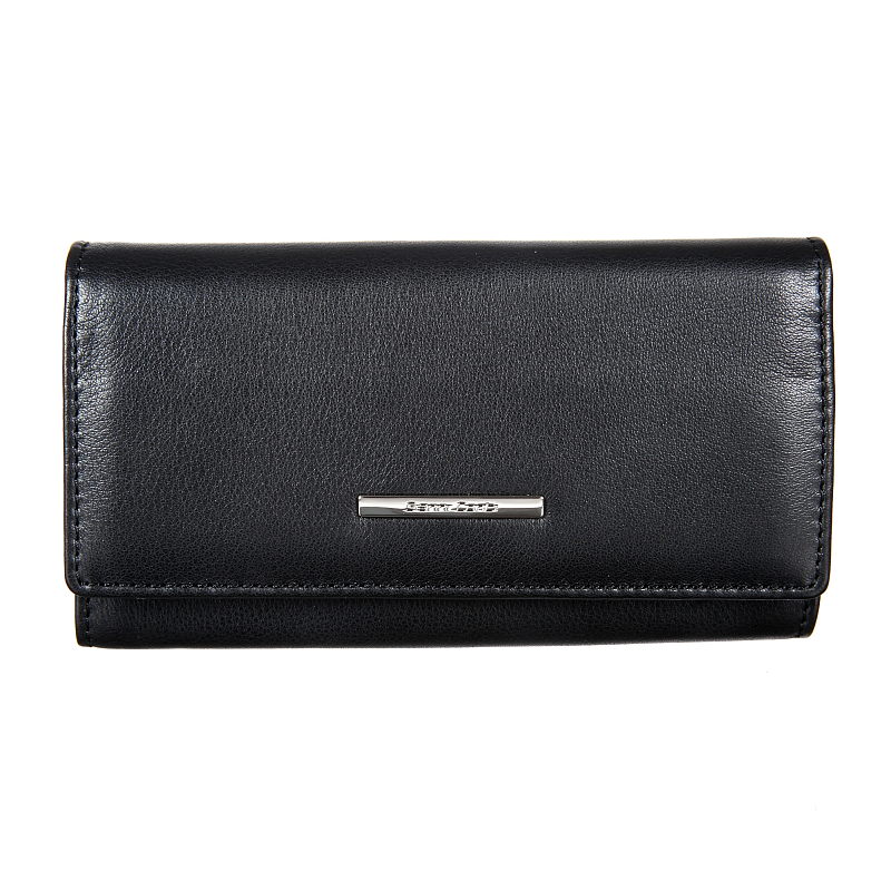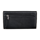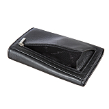 Внутри два отдела для купюр, продольный карман на молнии, два кармана для документов, семь кармашков для пластиковых карт. На передней стенке под клапаном два кармана, один из них на молнии. Снаружи на задней стенке отделение для монет на молнии и открытый продольный карман. Портмоне закрывается на кнопку.