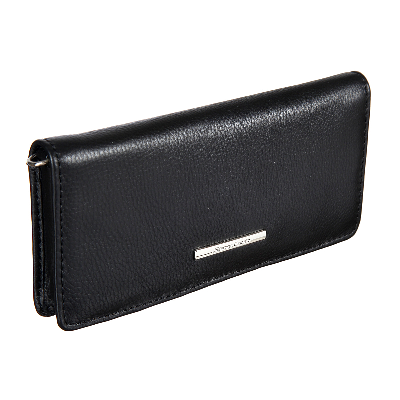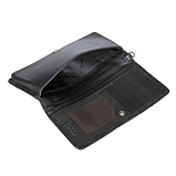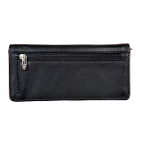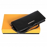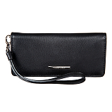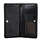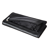 Женское чёрное портмоне из натуральной мягкой кожи с ремешком на запястье. Внутри одно вместительное отделение для купюр, два кармана для документов, шесть кармашков для пластиковых карт. С внешней стороны на задней стенке отделение для монет на молнии. Портмоне закрывается на кнопку.