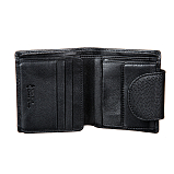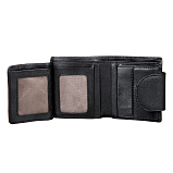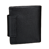 Внутри два отделения для купюр, карман для монет на кнопке, четыре потайных кармана, пять кармашков для пластиковых карт, два из них в сеточку. Портмоне закрывается клапаном на кнопке