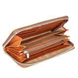 Портмоне закрывается на молнию. Внутри четыре отдела для купюр, два кармана для документов, отделение для монет на молнии, восемь кармашков для пластиковых карт
