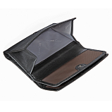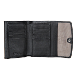 Внутри два отделения для купюр, карман для монет на кнопке, два потайных кармана и восемь кармашков для пластиковых карт. Закрывается на кнопку