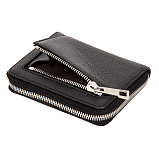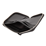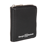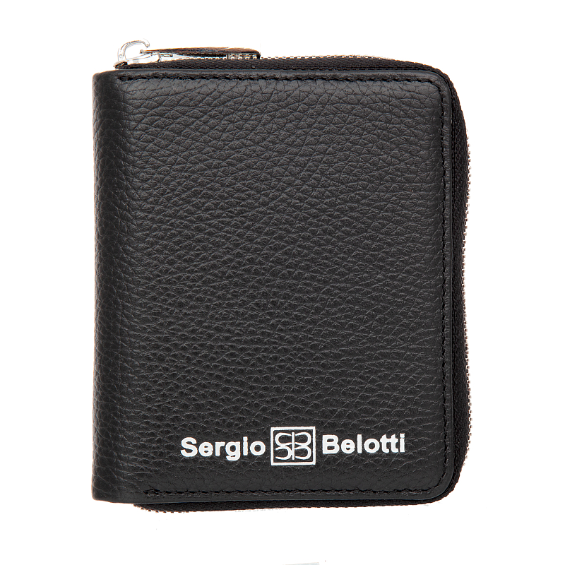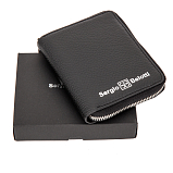 Женское чёрное кожаное портмоне на молнии. Внутри два отделения для купюр, четыре потайных кармана и шесть кармашков для пластиковых карт. На задней стороне расположен карман для монет на молнии. Товар упакован в подарочную коробку от бренда Sergio Belotti. Размеры: 13 х 10 х 3 см.