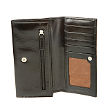 Внутри два отделения для купюр, потайной карман для документов, сетчатый карман для документов, карман на молнии, сетчатый карман и четыре кармашка для пластиковых карт. Закрывается клапаном на кнопке. С внешней стороны имеется карман для монет на молнии.