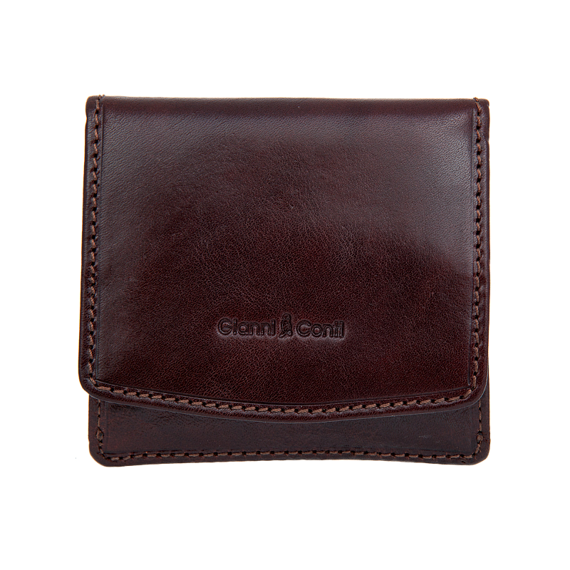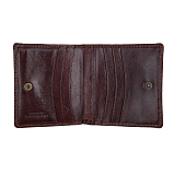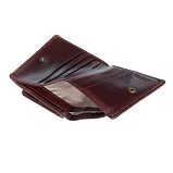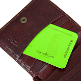 Миниатюрное коричневое кожаное портмоне от Gianni Conti. Закрывается на кнопку. Внутри два отделения для купюр, два потайных кармана и шесть кармашков для пластиковых карт. Снаружи расположена монетница на кнопке и потайной карман между отделами. Оснащено RFID защитой.