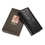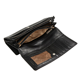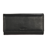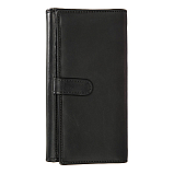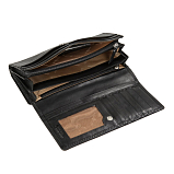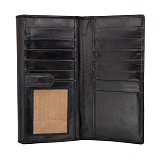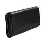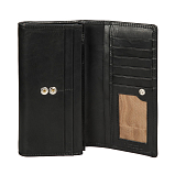 Чёрный женский кожаный кошелёк на кнопке. Внутри: 2 отделения для купюр, двойной отдел для монет на молнии. 4 потайных кармана, один из них на молнии,10 кармашков для пластиковых карт. На задней стенке отделение, закрывается клапаном на кнопке. Внутри него 2 кармана для документов, 13 кармашков для пластиковых карт. Имеет RFID Protection (защитный слой от считывания карт).