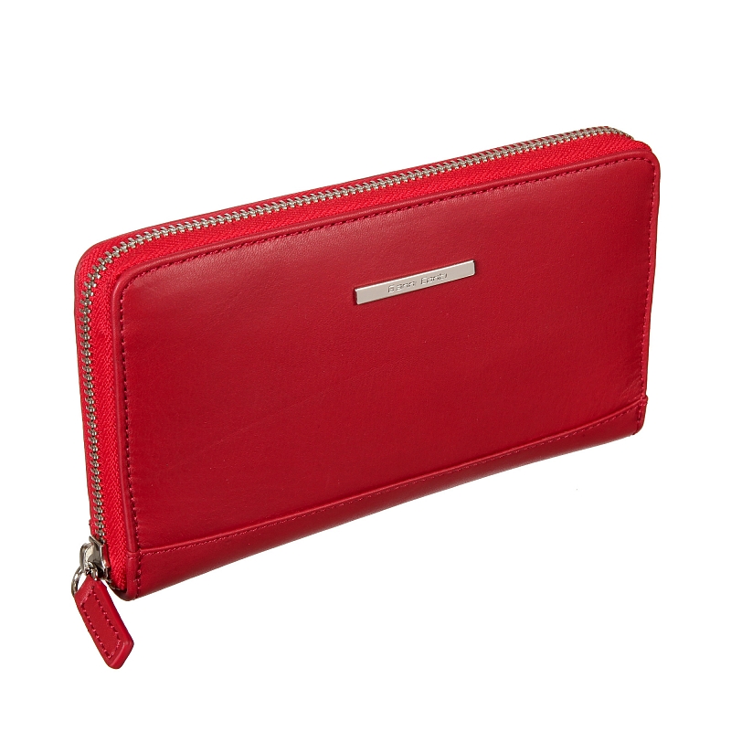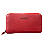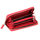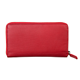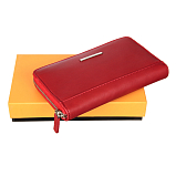Красный кошелёк на молнии из мягкой натуральной кожи. Внутри четыре отдела для купюр, отделение для монет на молнии, два кармана для документов, восемь кармашков для пластиковых карт, имеет RFID Protection (защитный слой от считывания карт).