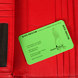 Внутри два отделения для купюр, карман для монет на молнии, два кармана для документов, два потайных кармана, сетчатый карман и одиннадцать кармашков для пластиковых карт. Закрывается клапаном на кнопке. С внешней стороны на задней стенке имеется карман на молнии. Имеет защитный слой от считывания карт RFID-Protection.