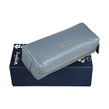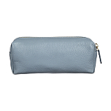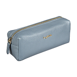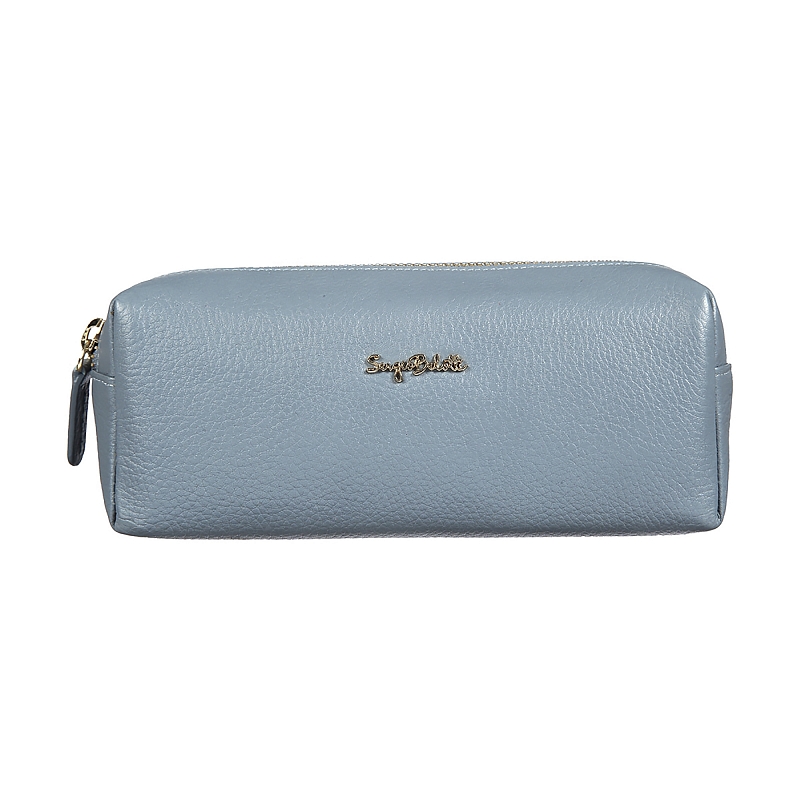 Женская голубая косметичка из натуральной кожи естественной фактуры. Внутри просторное отделение для косметики, кармашек для мелких предметов и съёмное кольцо для ключей на кнопках. Косметичка закрывается на молнию, цвет фурнитуры - золото. Товар упакован в подарочную коробку от бренда Sergio Belotti.